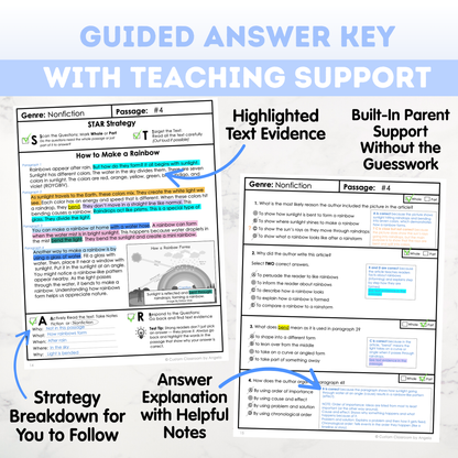 ✅ Detailed Answer Keys – Includes text evidence, notes, and color-coded explanations for each question.