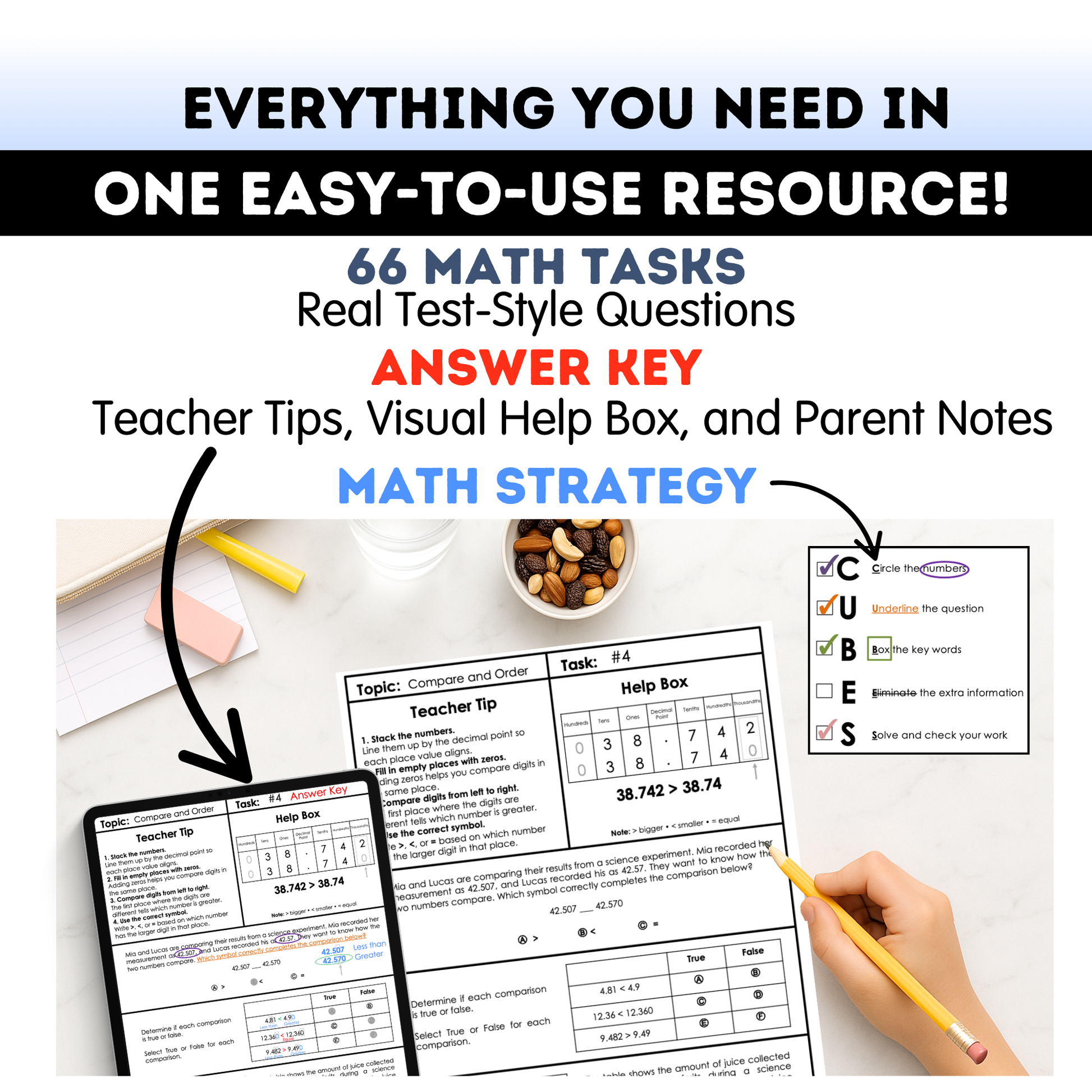 Students practice analyzing, choosing strategies, checking for errors, and justifying answers—just like on standardized tests.